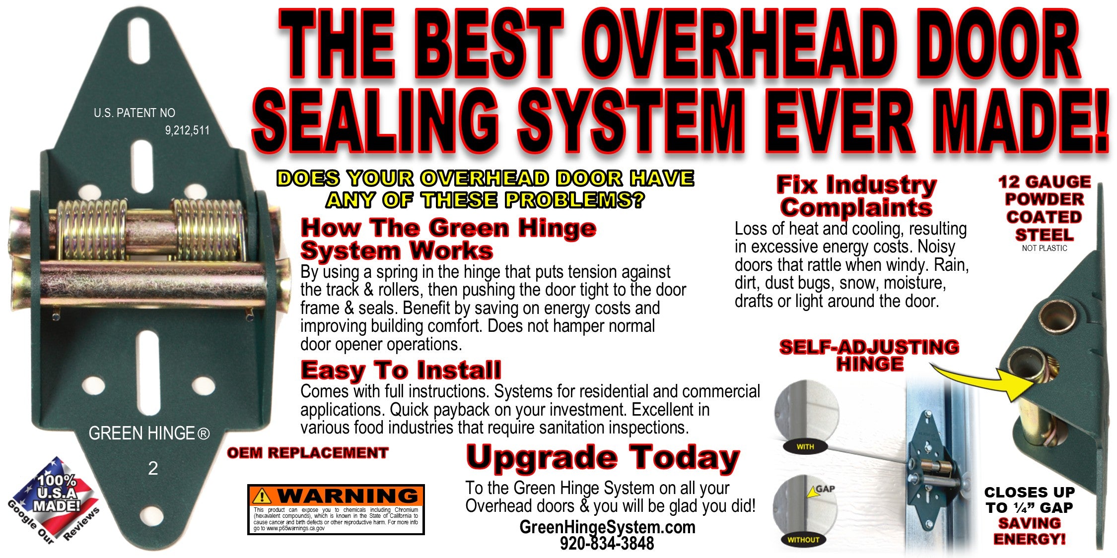 Made from heavy-duty 12-gauge powder-coated steel, the Green Hinge System is easy to install and fits most residential and commercial garage doors. Each panel self-adjusts to compensate for warped walls or misaligned tracks, creating the tightest seal possible at the door’s true sealing surface.